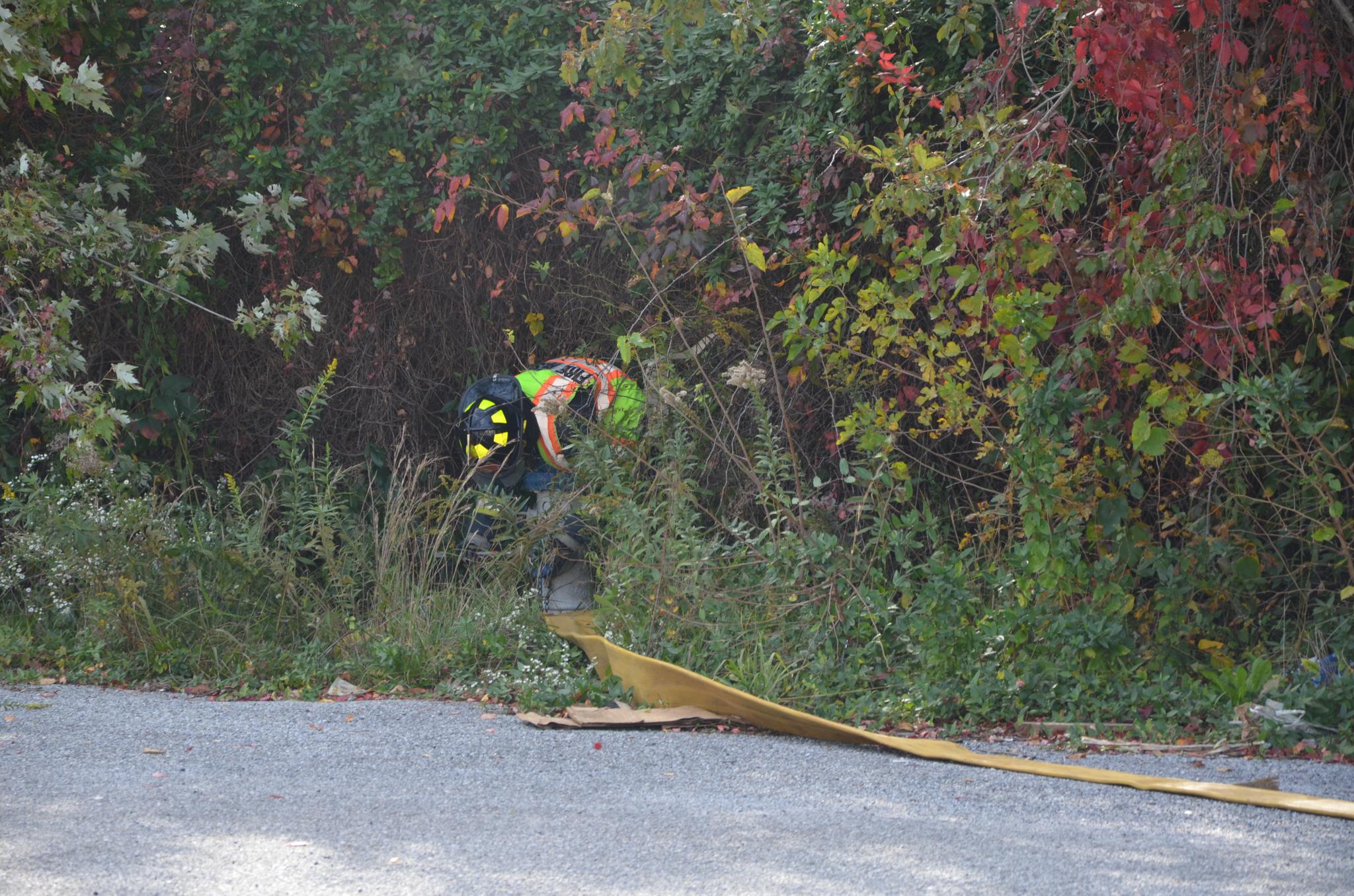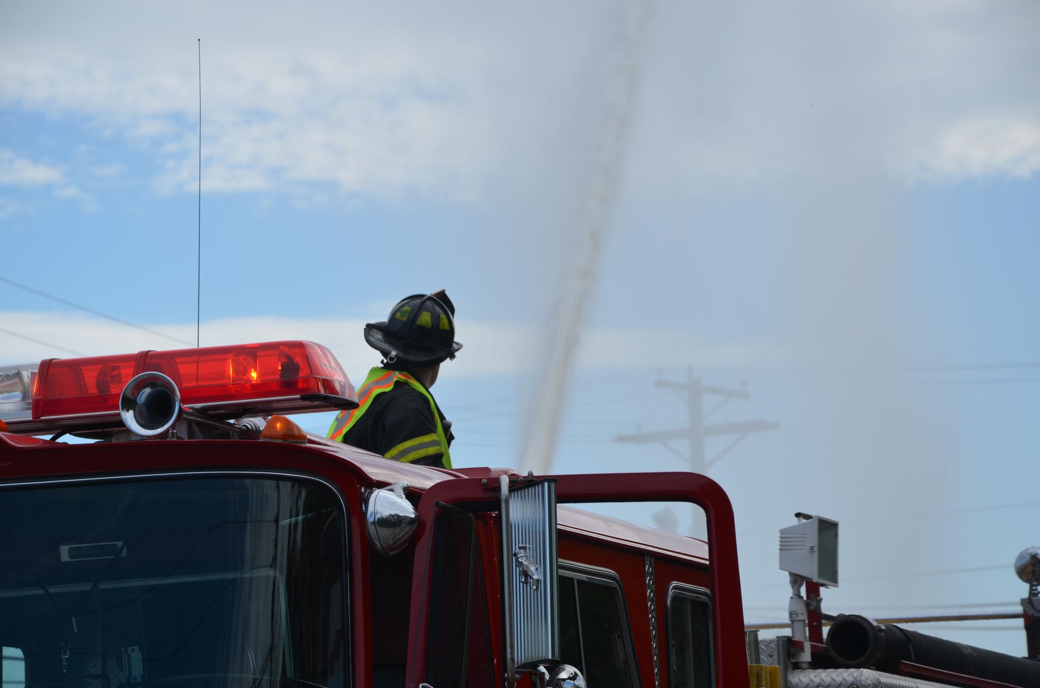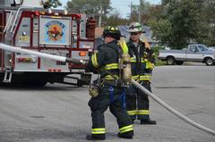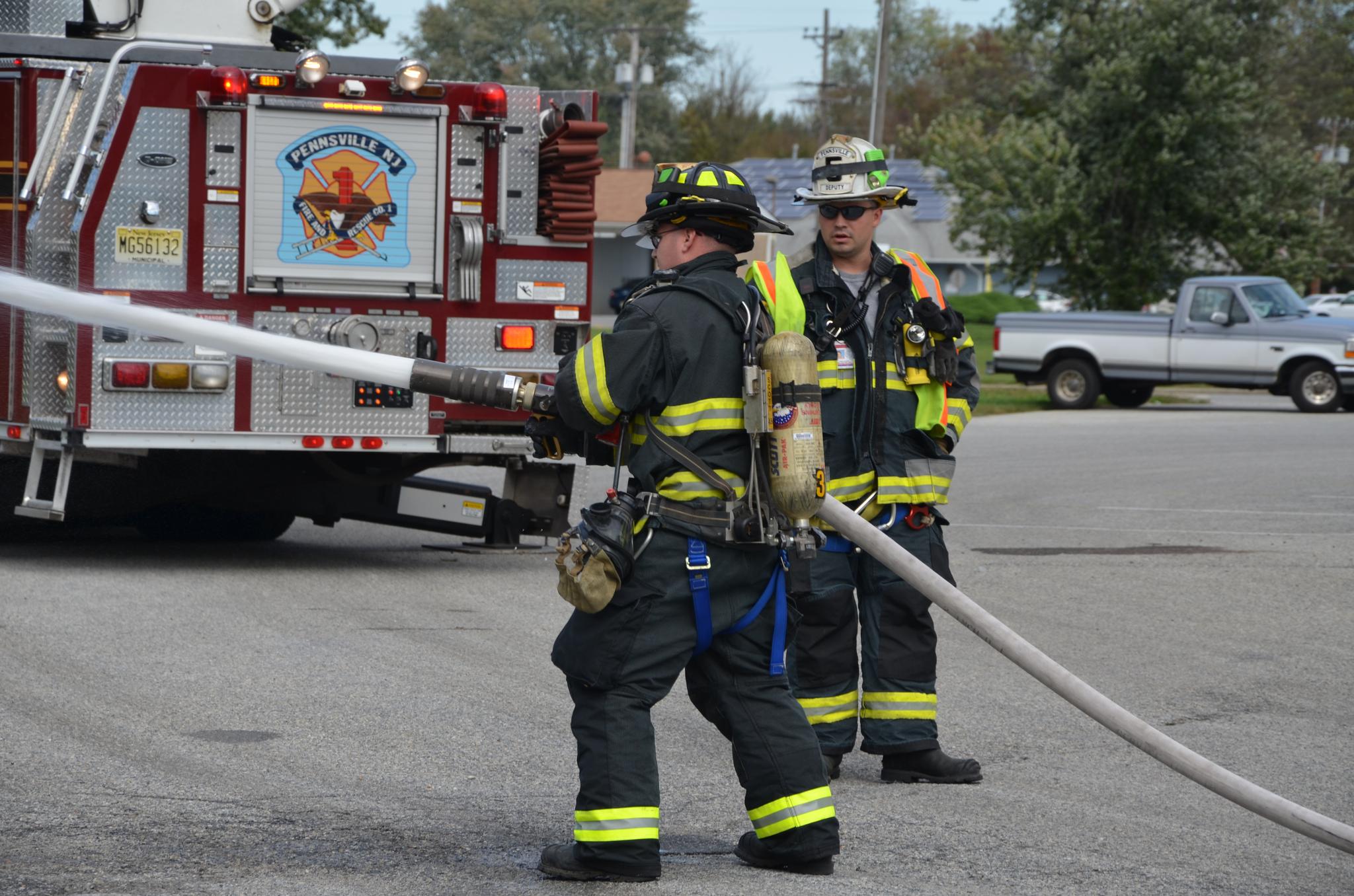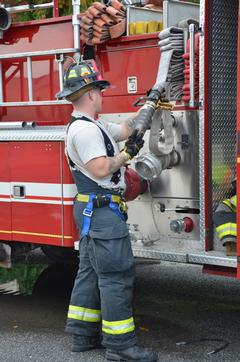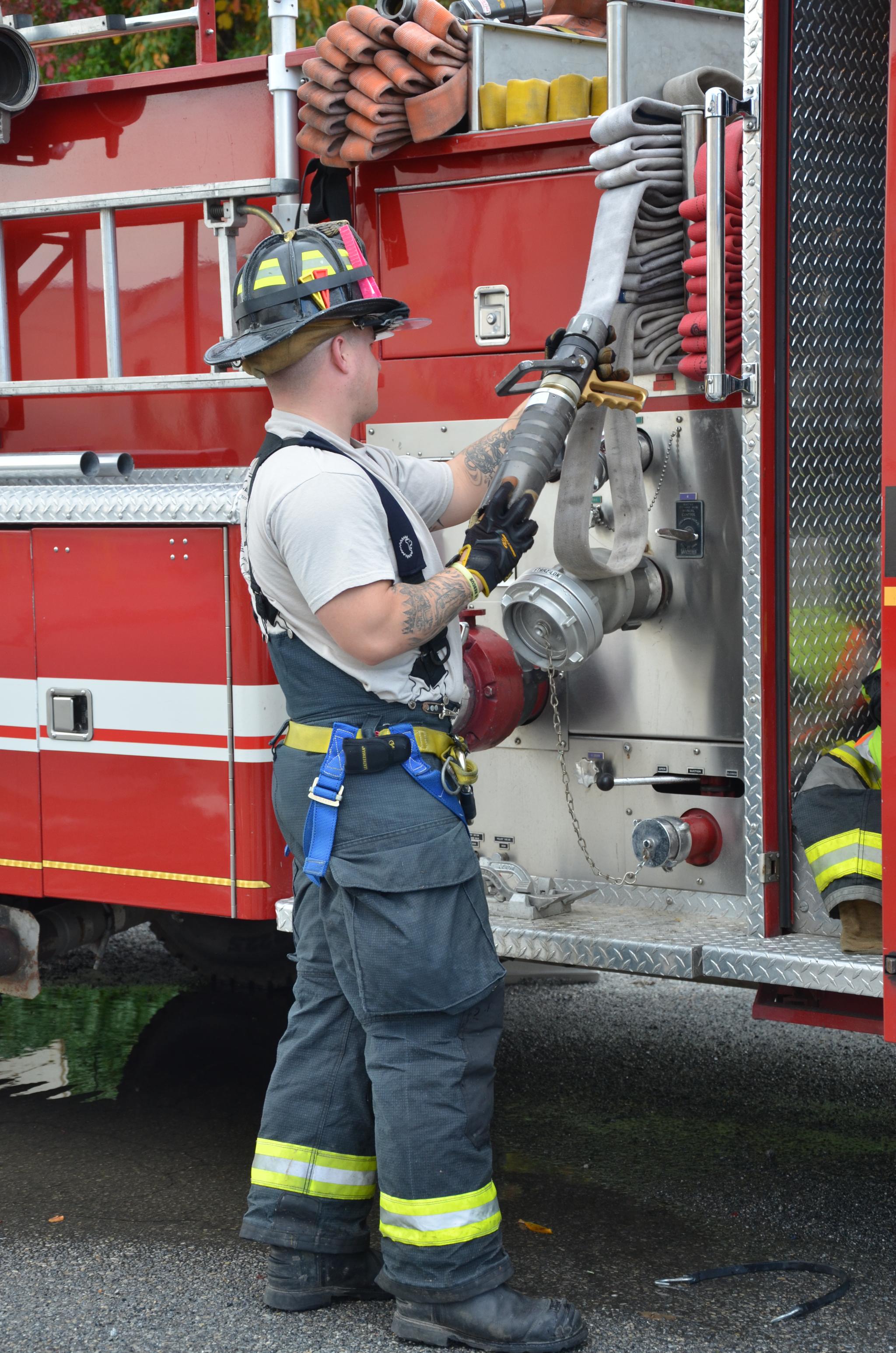 deputy chief Hagan reviews proper nozzle techiques with ff Sean Dennis