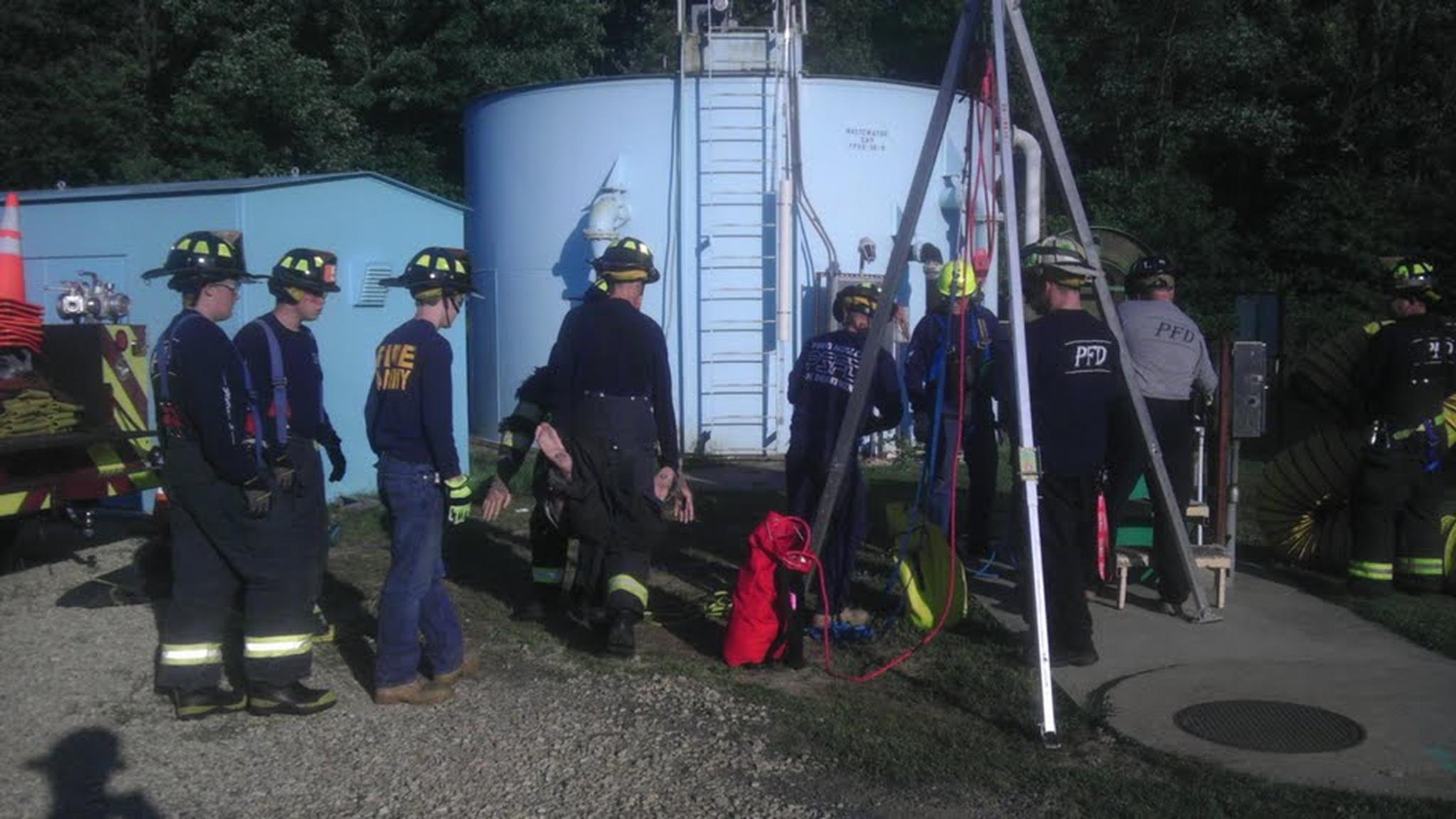On June 27th Pennsville Fire & Rescue conducted a training class on confined space rescue. Members of Station 5 rallied at the Pennsville Sewage Department to go over various rescue scenarios of injured or down personnel . These activities included setting up the confined space tri-pod, set up of the fresh air ventilation system, rigging, knots, setup and operation of various rope systems, various anchoring points, and lowering and hoisting of members and victims. We would like to thank the township of Pennsville and it's employees for making this possible and also those who participated and instructed.